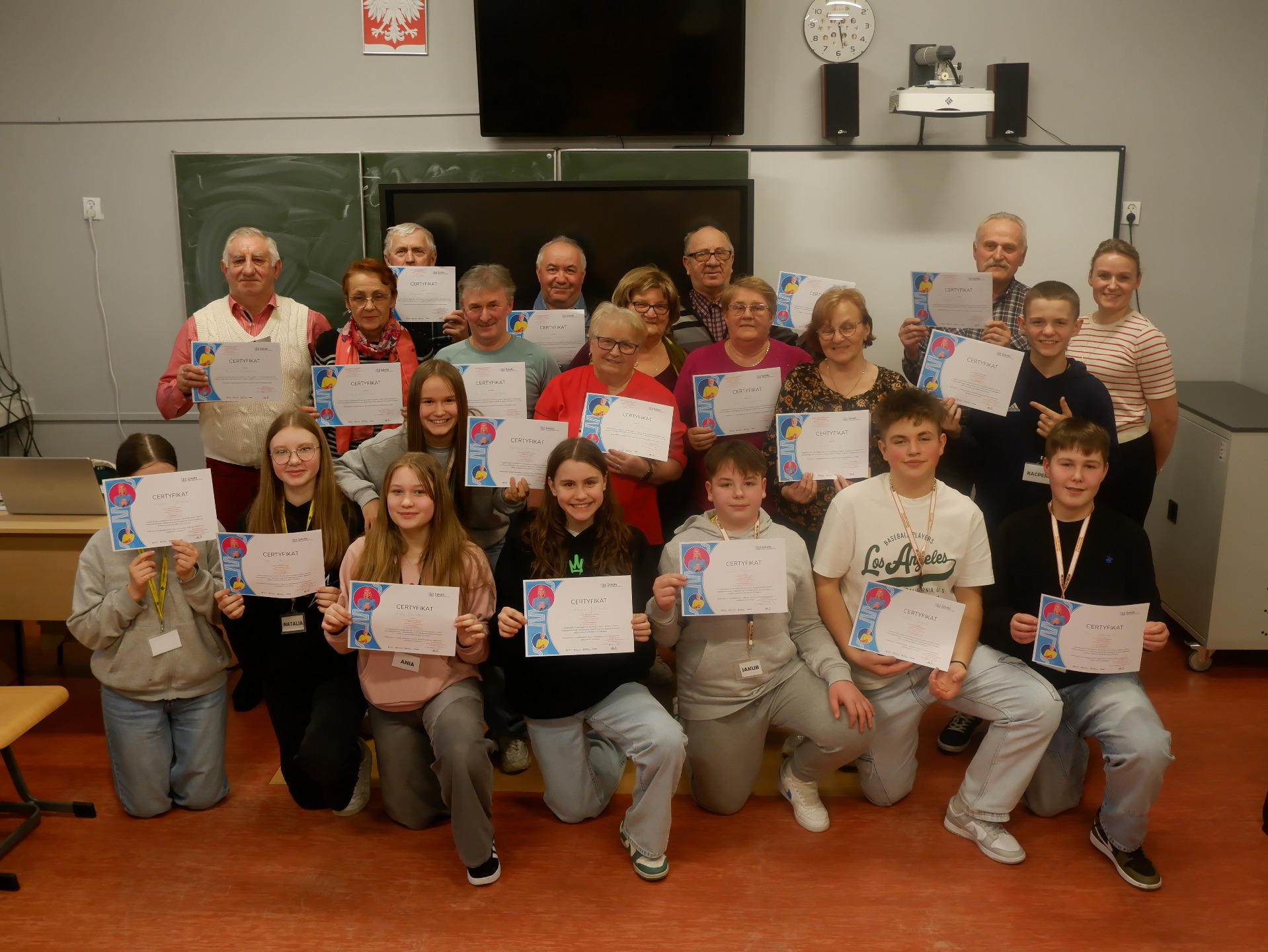 Wszystkie zajęcia zostały przeprowadzone w naszej szkole, spotkaliśmy się trzy razy, za każdym razem realizując dwie godziny warsztatów. Były to niezwykłe, pełne zaangażowania spotkania, które zaowocowały nie tylko przyrostem wiedzy i umiejętności w zakresie kompetencji cyfrowych seniorów i uczniów ale były też przestrzenią do nawiązywania międzypokoleniowych relacji. Uczniowie mogli odkryć w sobie pokłady empatii oraz rozwinąć umiejętność przekazywania wiedzy w sposób przystępny i zrozumiały. Seniorzy natomiast spędzili czas w szkolnych murach, do których wielu z nich uczęszczało przed laty.