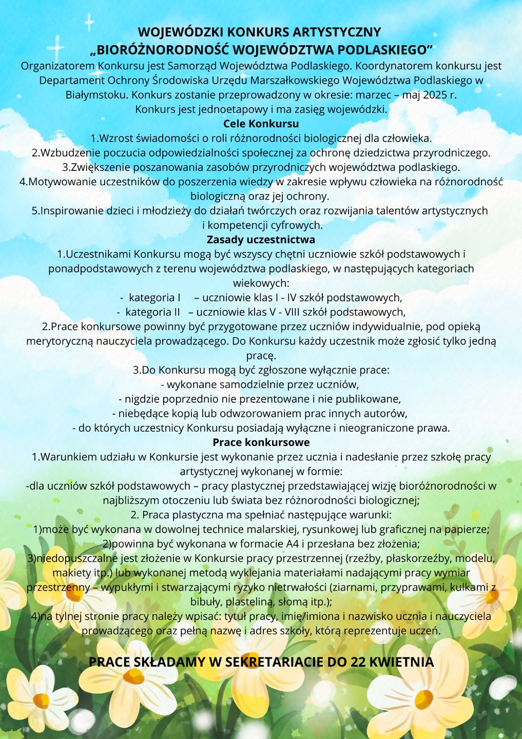 Serdecznie zapraszamy do udziału w Wojewódzkim Konkursie Artystyczny "Bioróżnorodność Województwa Podlaskiego", którego organizatorem jest Samorząd Województwa Podlaskiego.