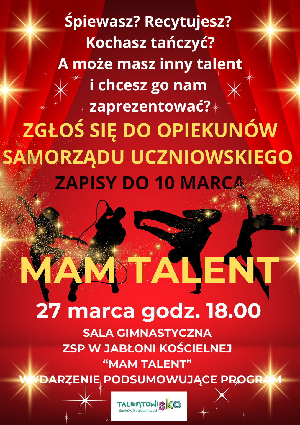 Serdecznie zapraszamy do wzięcia udziału w konkursie "Mam Talent" , który podsumowuje projekt "TalentowiSKO". Więcej informacji znajdziecie w umieszczonych załącznikach.