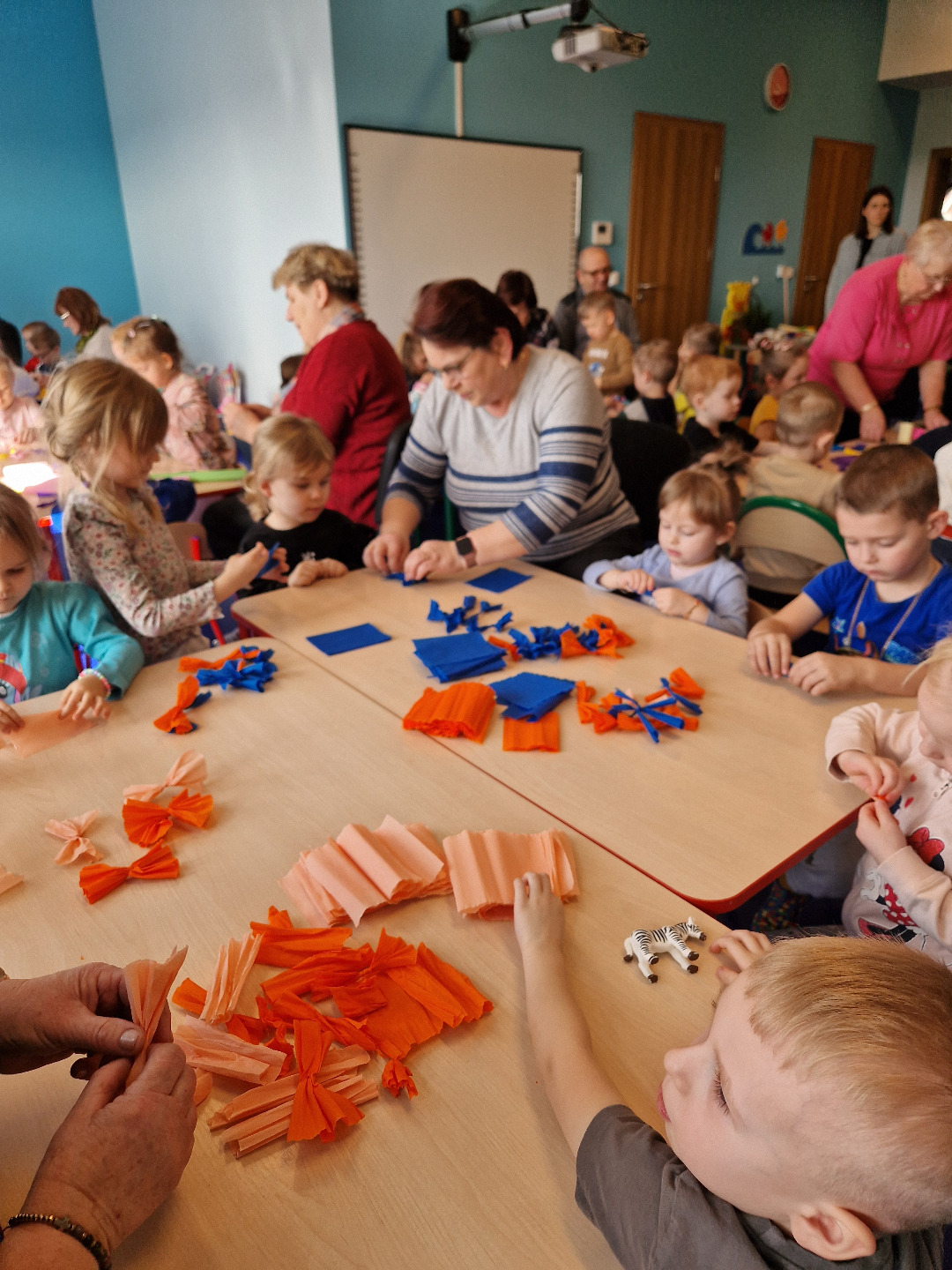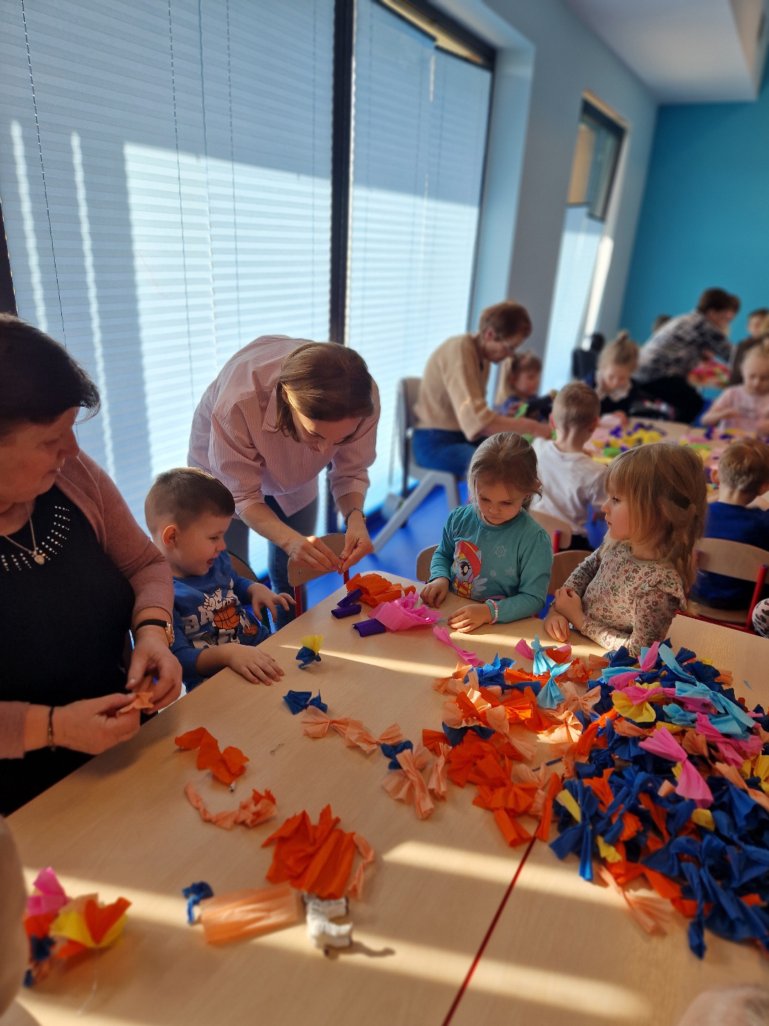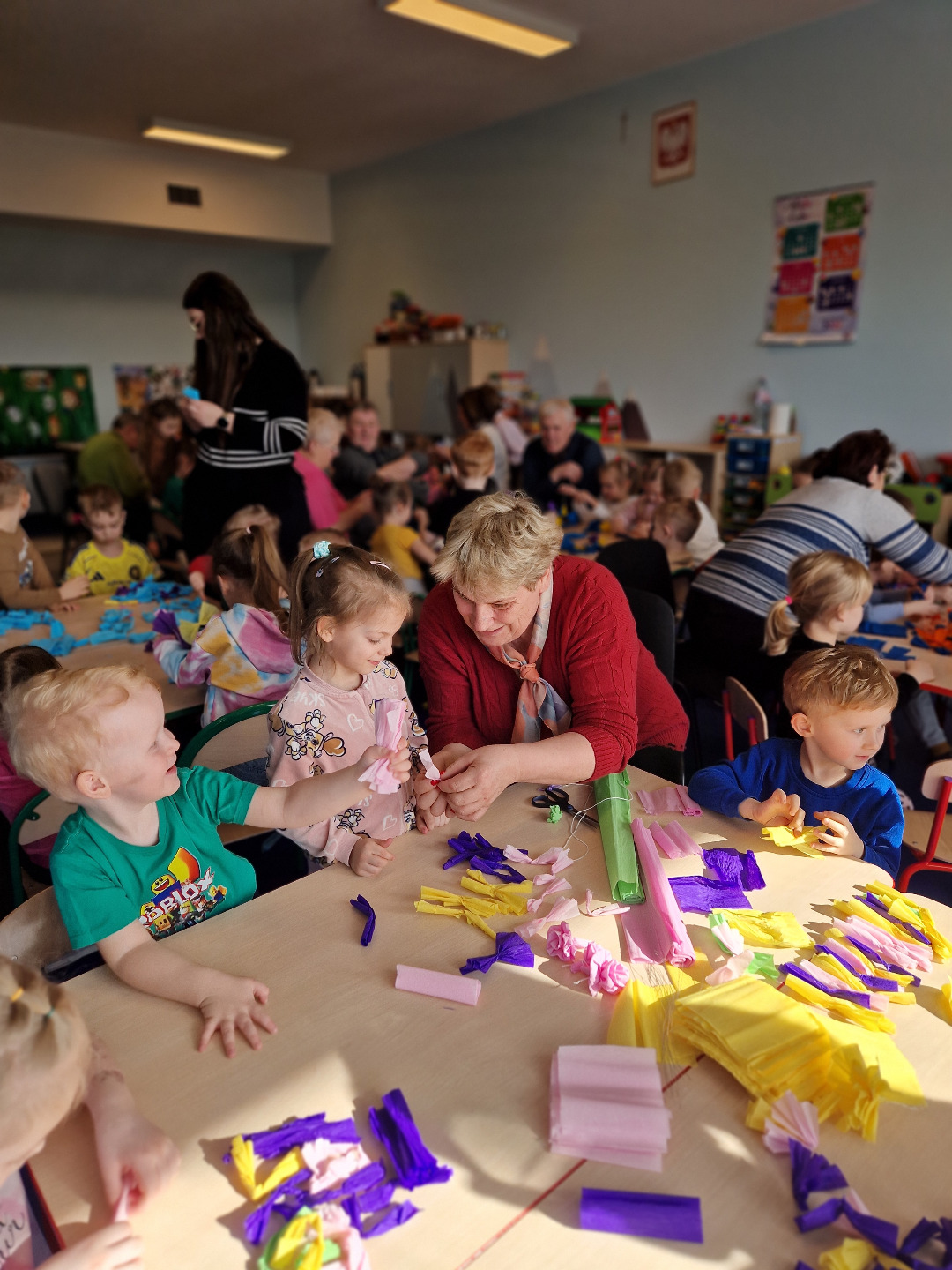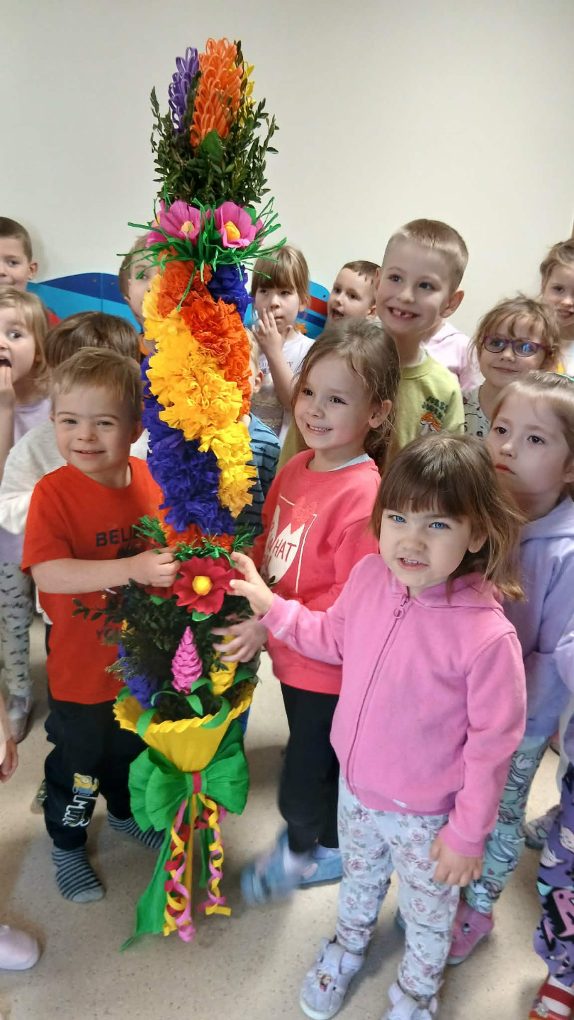 Następnie odbyły się warsztaty plastyczne. Seniorzy pokazali dzieciom, jak wykonać kolorowe kwiaty z bibuły, które stały się elementem palmy wielkanocnej. Wszystkie wykonane przez dzieci kwiaty zostały połączone w jedną wspólną palmę, przygotowaną na konkurs.Wspólnie wykonana palma została zgłoszona do 28. Regionalnego Konkursu na Wykonanie Palmy Wielkanocnej organizowanego przez Muzeum Rolnictwa im. ks. Krzysztofa Kluka w Ciechanowcu. Dzięki temu przedszkolaki miały możliwość nie tylko rozwijania swoich umiejętności manualnych, ale również uczestniczenia w przekazywaniu tradycji z pokolenia na pokolenie.