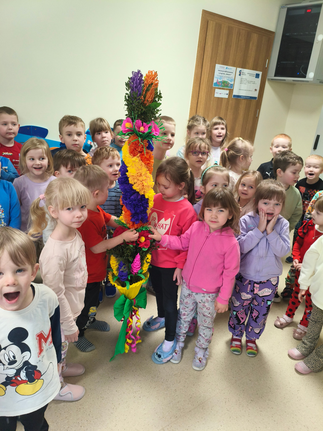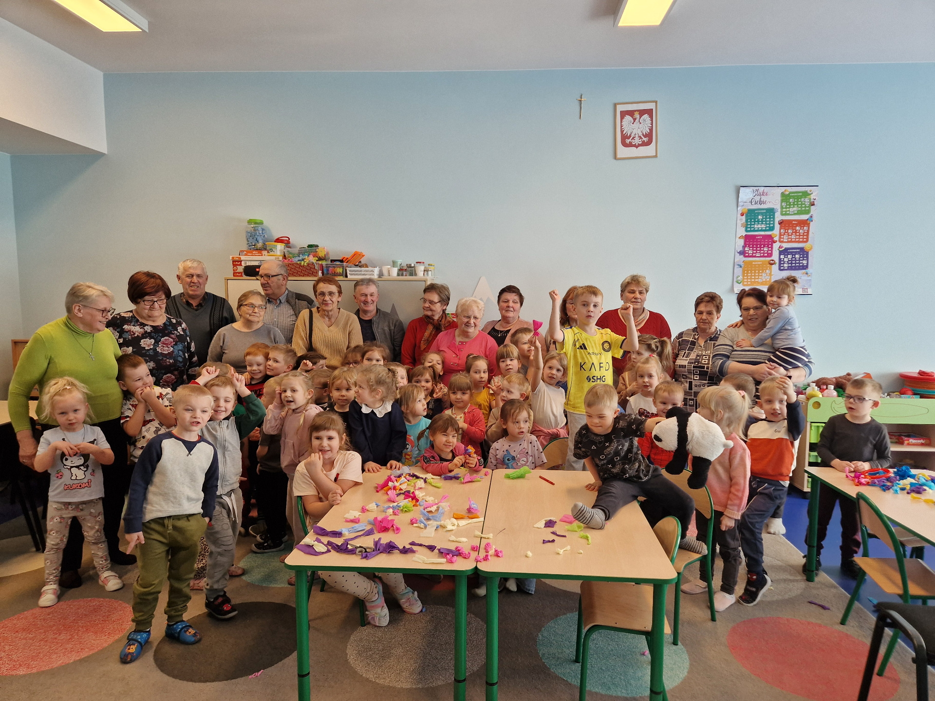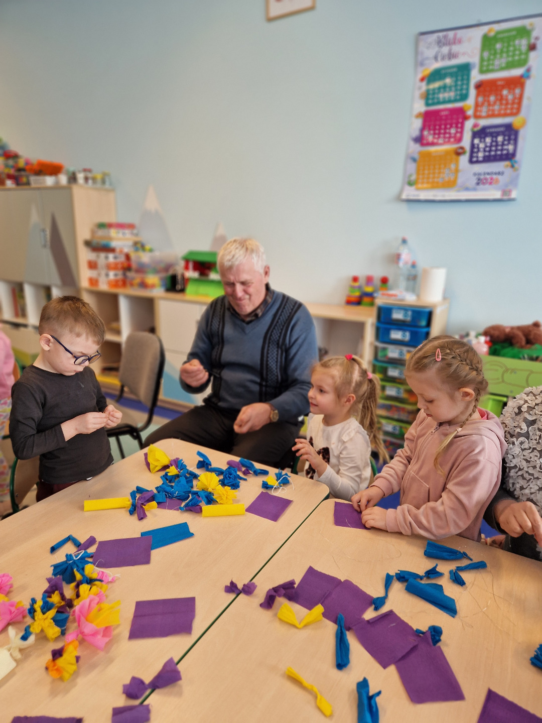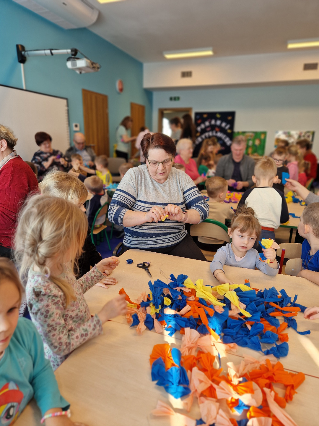 Następnie odbyły się warsztaty plastyczne. Seniorzy pokazali dzieciom, jak wykonać kolorowe kwiaty z bibuły, które stały się elementem palmy wielkanocnej. Wszystkie wykonane przez dzieci kwiaty zostały połączone w jedną wspólną palmę, przygotowaną na konkurs.Wspólnie wykonana palma została zgłoszona do 28. Regionalnego Konkursu na Wykonanie Palmy Wielkanocnej organizowanego przez Muzeum Rolnictwa im. ks. Krzysztofa Kluka w Ciechanowcu. Dzięki temu przedszkolaki miały możliwość nie tylko rozwijania swoich umiejętności manualnych, ale również uczestniczenia w przekazywaniu tradycji z pokolenia na pokolenie.