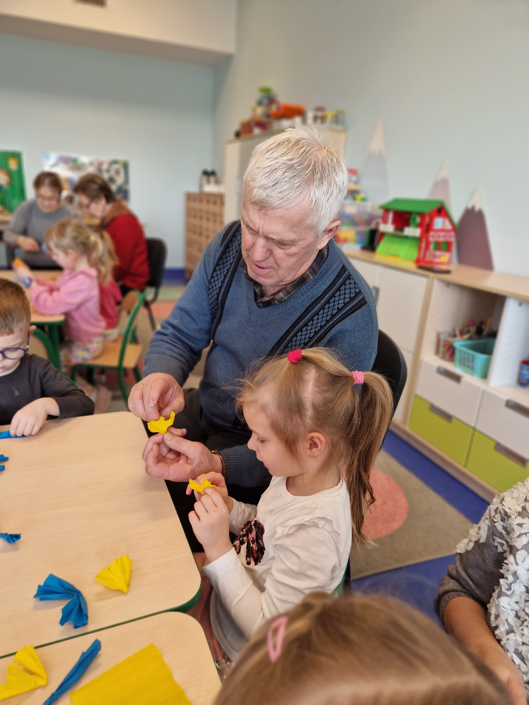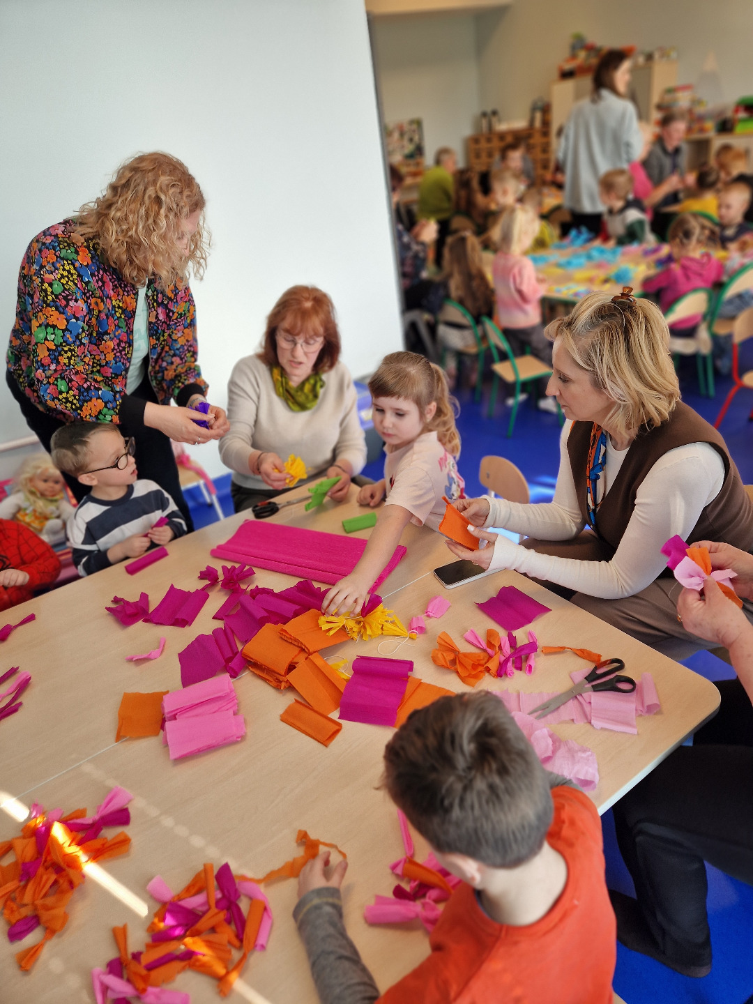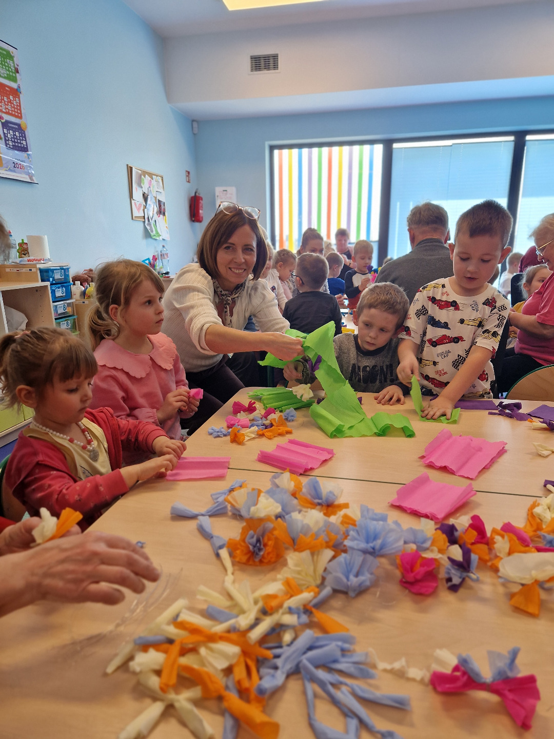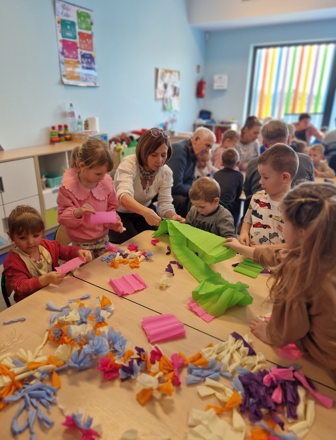 Następnie odbyły się warsztaty plastyczne. Seniorzy pokazali dzieciom, jak wykonać kolorowe kwiaty z bibuły, które stały się elementem palmy wielkanocnej. Wszystkie wykonane przez dzieci kwiaty zostały połączone w jedną wspólną palmę, przygotowaną na konkurs.Wspólnie wykonana palma została zgłoszona do 28. Regionalnego Konkursu na Wykonanie Palmy Wielkanocnej organizowanego przez Muzeum Rolnictwa im. ks. Krzysztofa Kluka w Ciechanowcu. Dzięki temu przedszkolaki miały możliwość nie tylko rozwijania swoich umiejętności manualnych, ale również uczestniczenia w przekazywaniu tradycji z pokolenia na pokolenie.