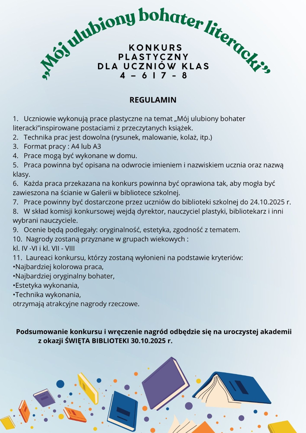 Biblioteka szkolna zaprasza wszystkich uczniów klas 4-8 do wzięcia udziału w szkolnym konkursie plastycznym MÓJ ULUBIONY BOHATER LITERACKI.