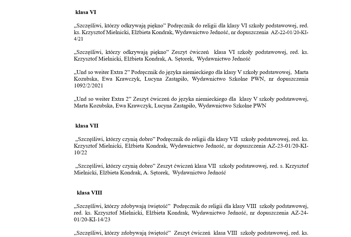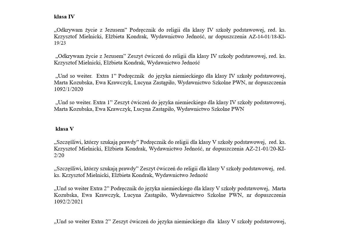 W załączniku znajduje się spis podręczników i zeszytów ćwiczeń, które należy zakupić we własnym zakresie. Są to religia: dla klas 0-8 oraz język niemiecki dla klas 4-6.