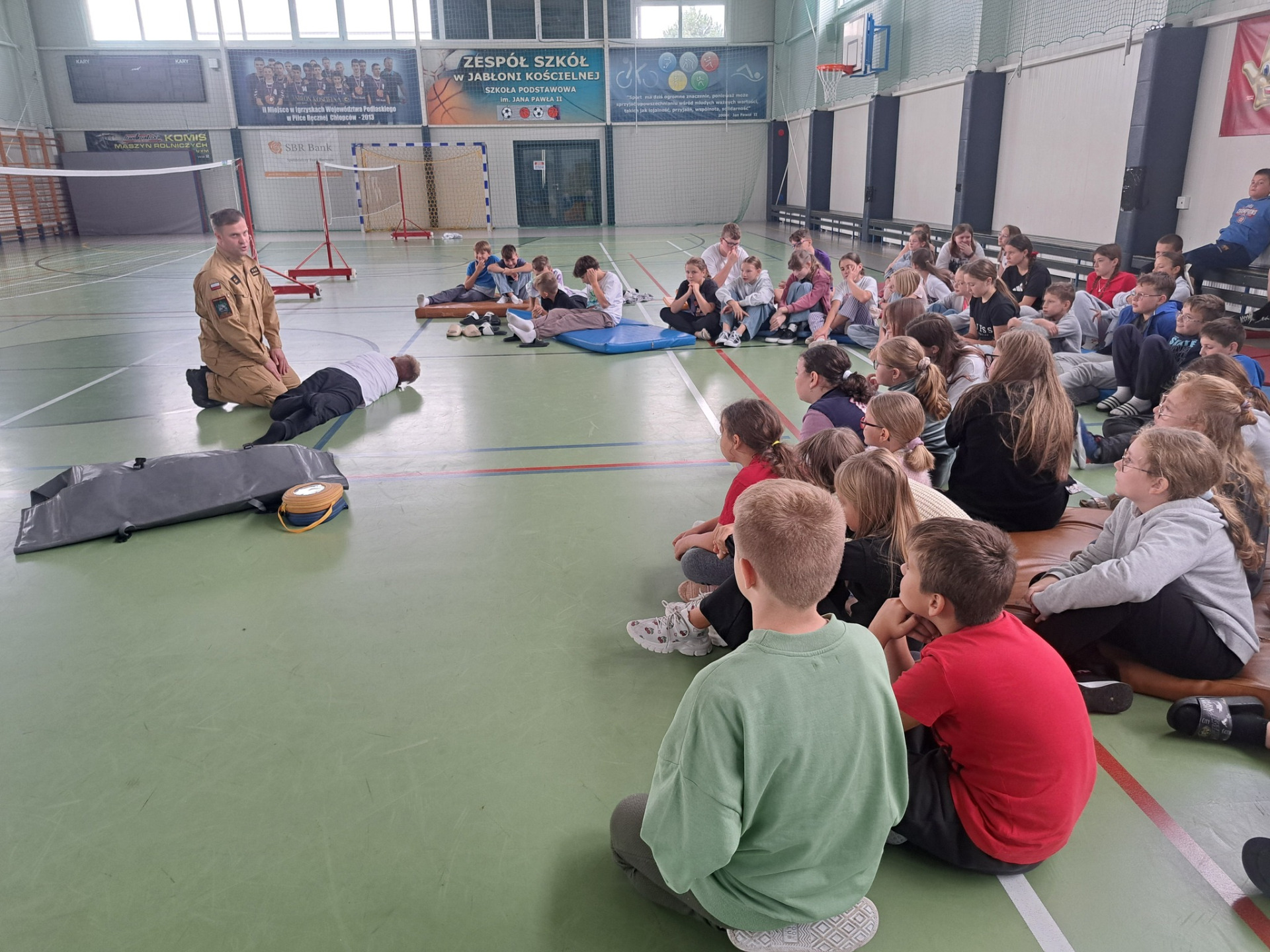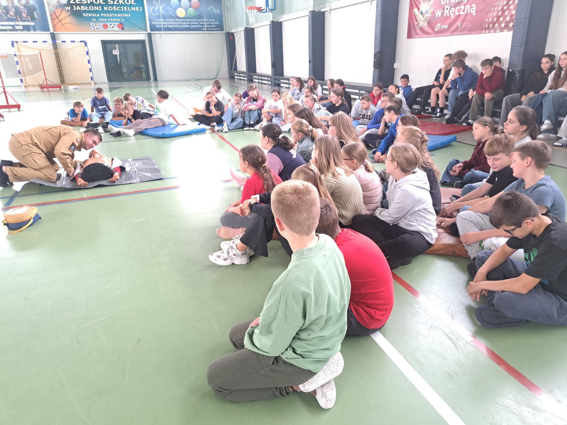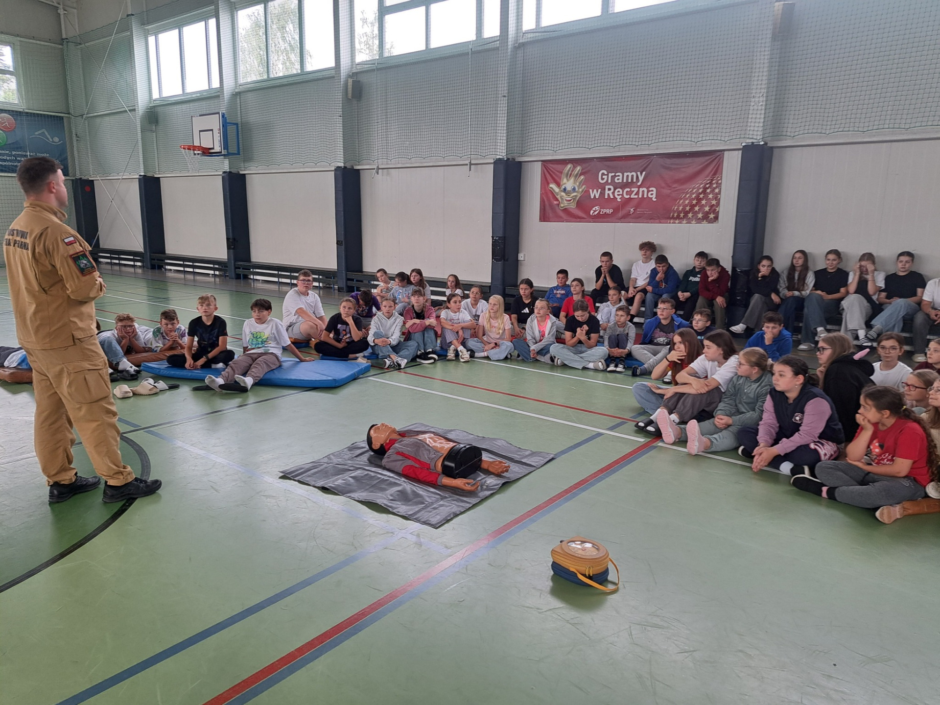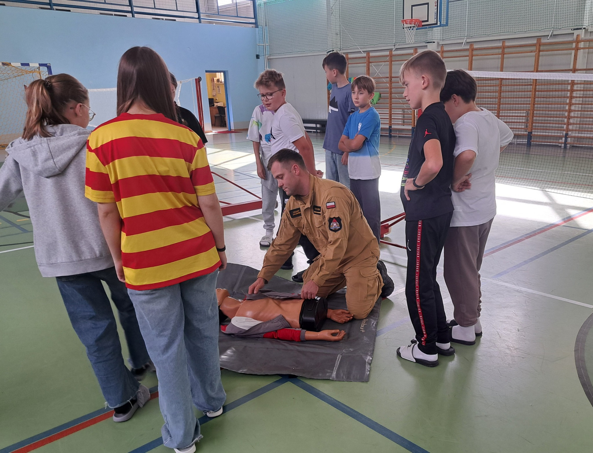 Po zakończeniu ewakuacji, w ramach działań prewencyjnych, zorganizowano spotkanie z przedstawicielem straży pożarnej, który przeprowadził naszym uczniom podstawowe szkolenie z zakresu udzielania pierwszej pomocy przedmedycznej. Dziękujemy PSP w Wysokiem Mazowieckiem za współpracę.