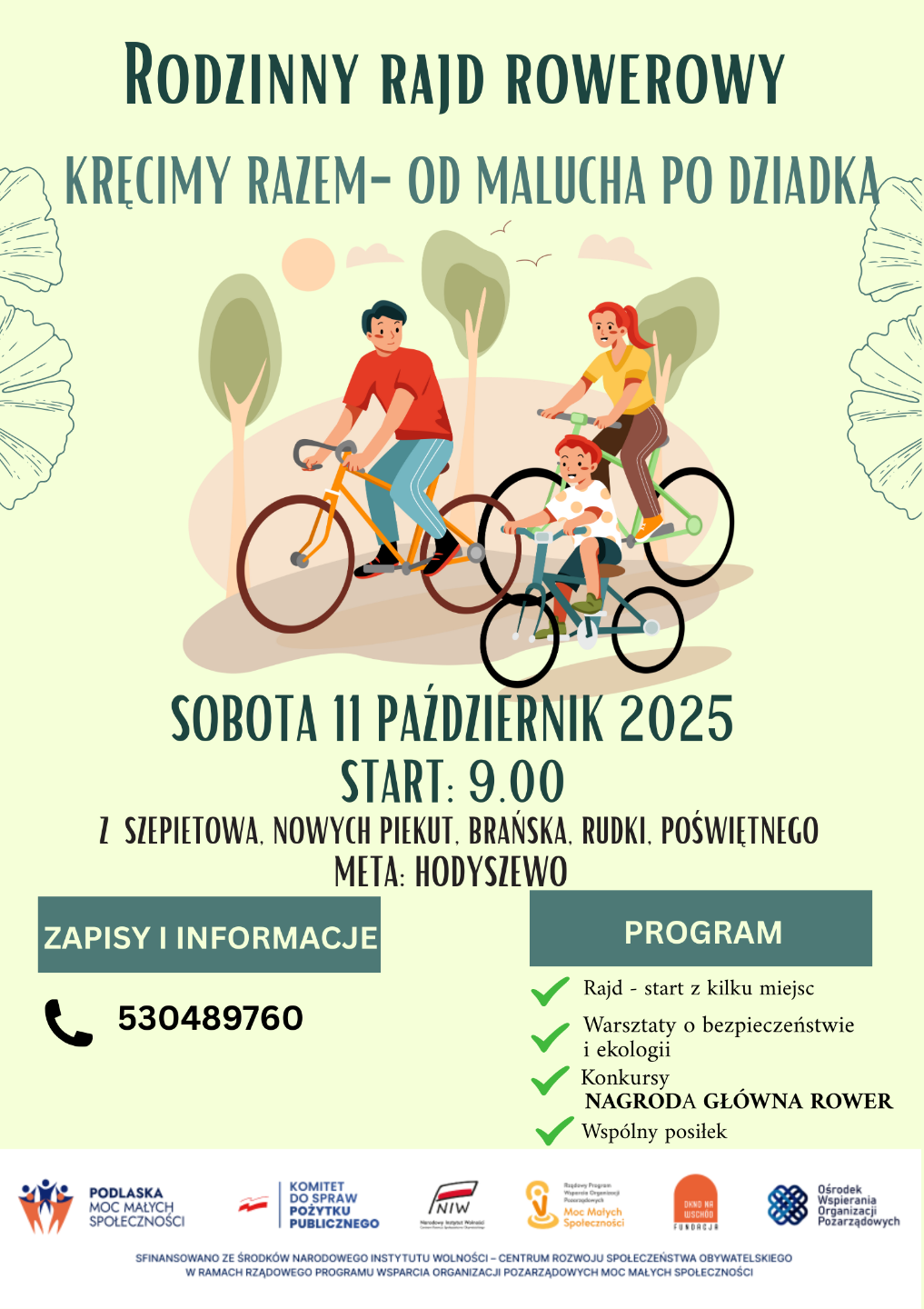 Fundacja Pojednanie z Hodyszewa zaprasza wszystkich w sobotę 11 października 2025 roku na Rodzinny Rajd Rowerowy pod hasłem: „Kręcimy razem – od malucha po dziadka”.