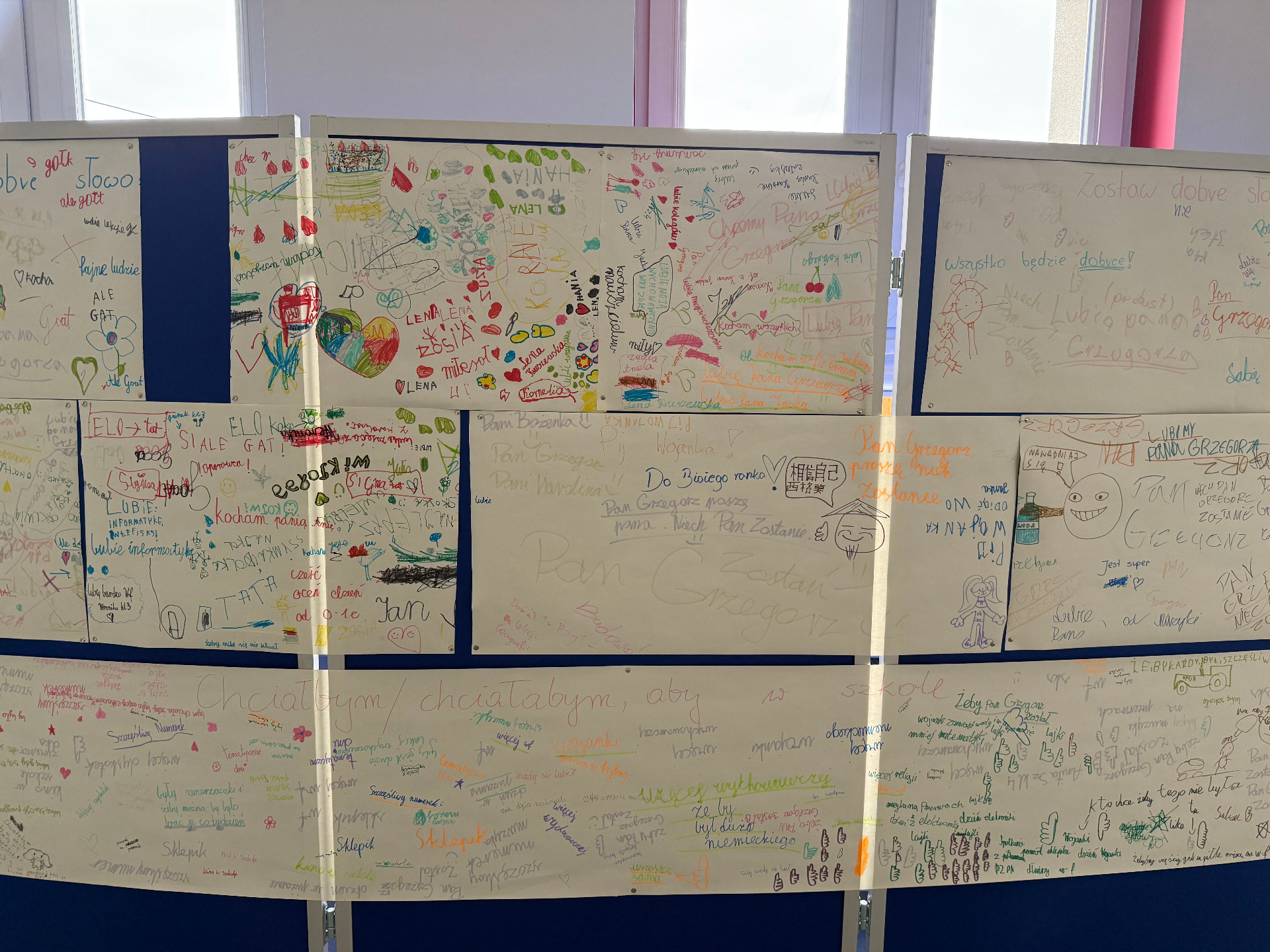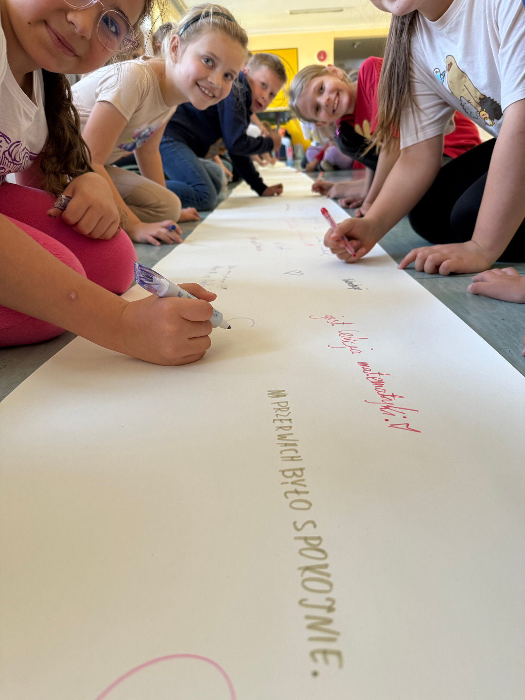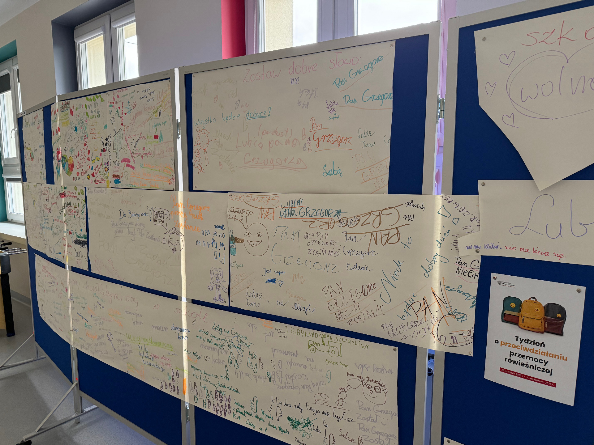 Tydzień o Dobrych Relacjach i Tydzień o Przeciwdziałaniu Przemocy Rówieśniczej to trwający w ubiegłym tygodniu czas przypominania o tym, co ważne jest w przestrzeni szkolnej. Kształtowanie pozytywnych relacji w grupach rówieśniczych do podstawa przeciwdziałania przemocy rówieśniczej. Nie jesteśmy w stanie zmusić uczniów aby się lubili, możemy ich nauczyć aby się szanowali mimo różnic. Możemy im przypominać, iż w każdym z nas jest potrzeba bycia dostrzeżonym i przyjętym do grupy. Możemy zaznaczać, iż bezpieczne środowisko szkolne zależy od nas wszystkich. Dlatego uczniowie w klasach, przedszkolaki w grupach rozmawiali w ubiegłym tygodniu o tym, jak ważne jest bycie “dobrą koleżanką i dobrym kolegą”, jak ważne jest okazywanie sympatii a jak trudne jest odbieranie wrogości i odrzucenia. Na szkolnych korytarzach rozłożyliśmy papierowe “chodniki”, na których uczniowie mogli zapisać swoje opinie na temat tego, co lubią a czego nie lubią w szkole, co chcieliby aby w szkole się wydarzyło, aby było nam wszystkim lepiej. Niektórzy potraktowali to zadanie jako sposób na spędzenie przerwy, miejsce na niezbyt poważne wypowiedzi. Byli też tacy, którzy podzielili się swoimi obawami, ulubionymi zajęciami, napisali na poważnie, czego nie lubią, czego się obawiają. Kolejnego dnia w podobnym zadaniu, na papierowym “chodniku” uczniowie mogli napisać kilka miłych słów, wzmacniających dla innych. Niektórzy wzmocnili przez to siebie, inaczej spędzili przerwę, ponownie okazali sympatię do zajęć, nauczycieli, koleżanek i kolegów.