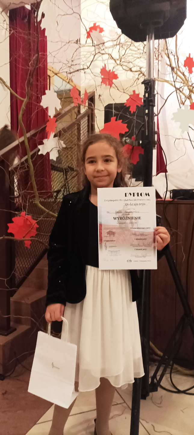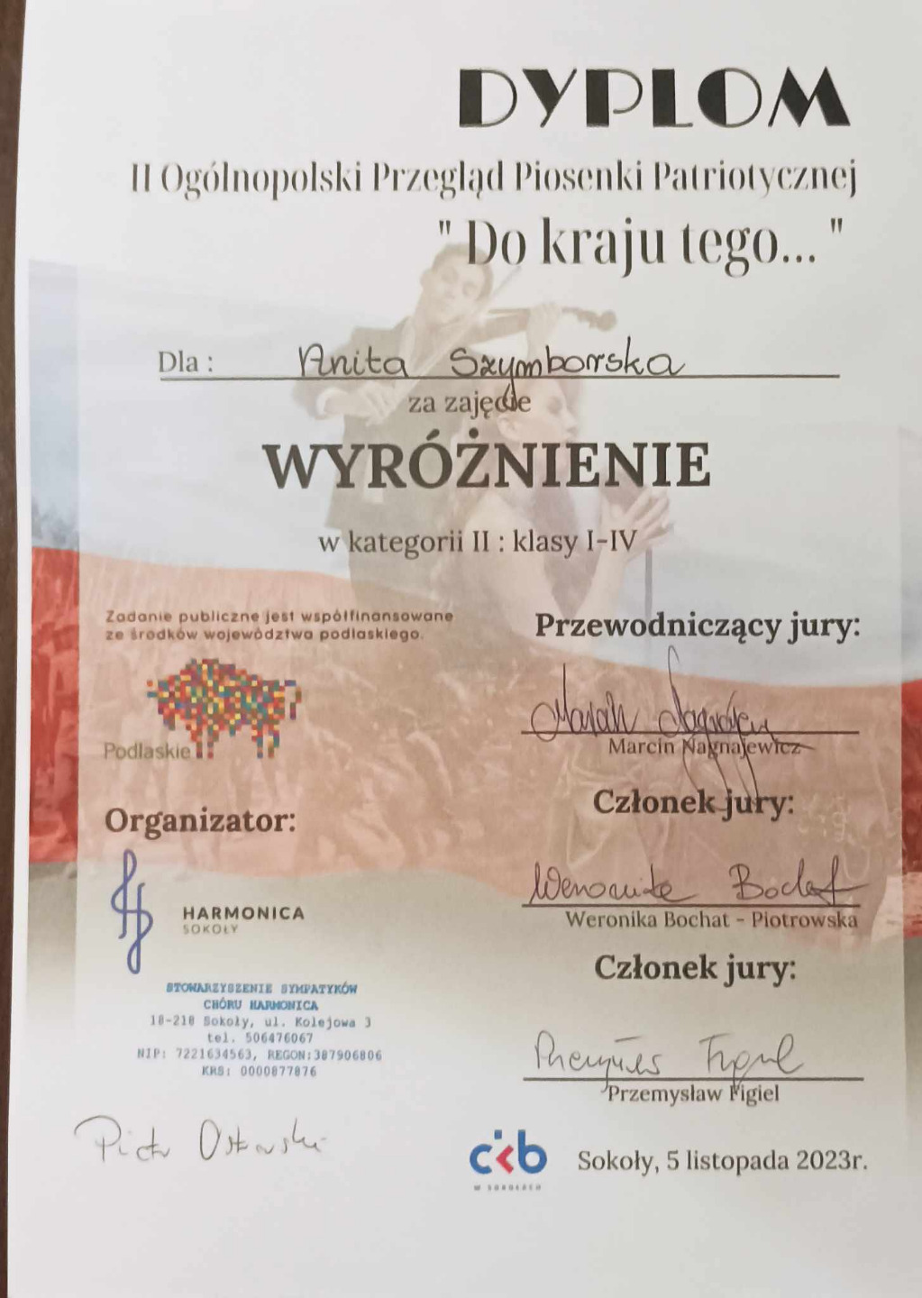 Serdecznie gratulujemy naszej uczennicy kl. II - Anitce Szymborskiej, która zdobyła wyróżnienie w II Ogólnopolskim Przeglądzie Piosenki Patriotycznej "Do kraju tego...". Anita artystycznie została przygotowana na zajęciach w Gminnym Ośrodku Kultury w Szepietowie.